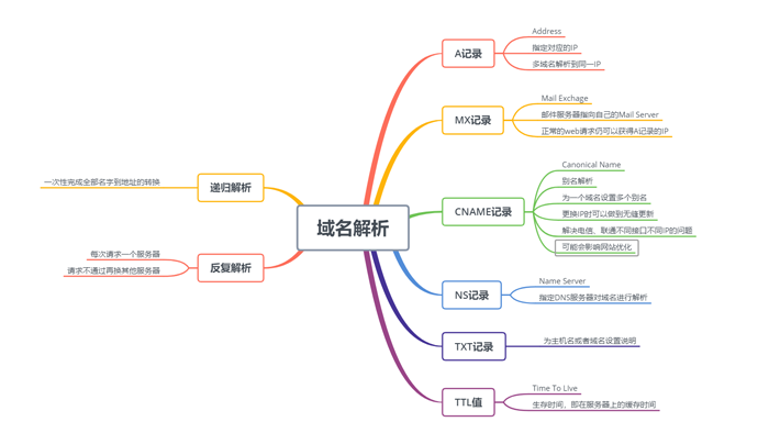 這篇文章除了想要介紹一下域名的解析類型和方式,還想要以這個知識點來初步試驗思維導圖的學習使用。以下就是我對域名解析的思維導圖學習歸納。